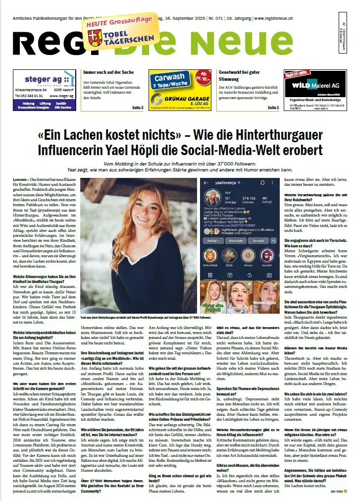 Mit 100 Ausgaben pro Jahr bieten wir Ihnen eine umfassende Berichterstattung zu den Geschehnissen und zum Leben in den Gemeinden Aadorf, Bichelsee-Balterswil, Braunau, Eschlikon, Fischingen, Lommis, Münchwilen, Rickenbach Sirnach, Tobel-Tägerschen, Wängi und Wilen. Ob lokale Wirtschaft, gesellschaftliche Entwicklungen, politische Entscheidungen, kulturelle Highlights oder die neuesten Sportereignisse – mit REGI Die Neue sind Sie immer bestens informiert.